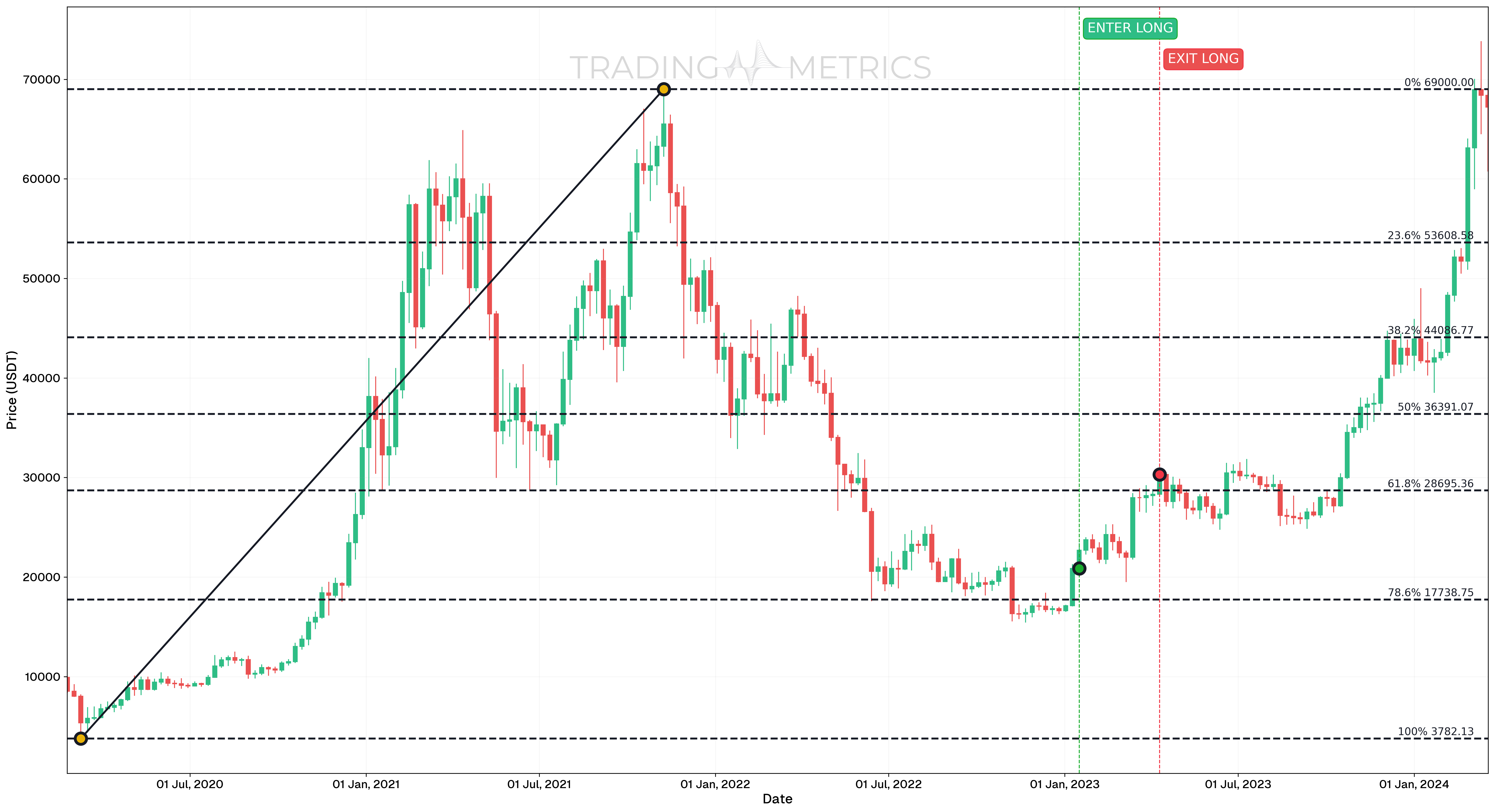 - Application of Fibonacci Retracement: In this highly volatile market, Fibonacci retracement becomes essential for navigating extreme fluctuations. Traders rely on retracement levels to identify strategic entry and exit points, as these levels can signal critical reversal points amid unpredictable price action.