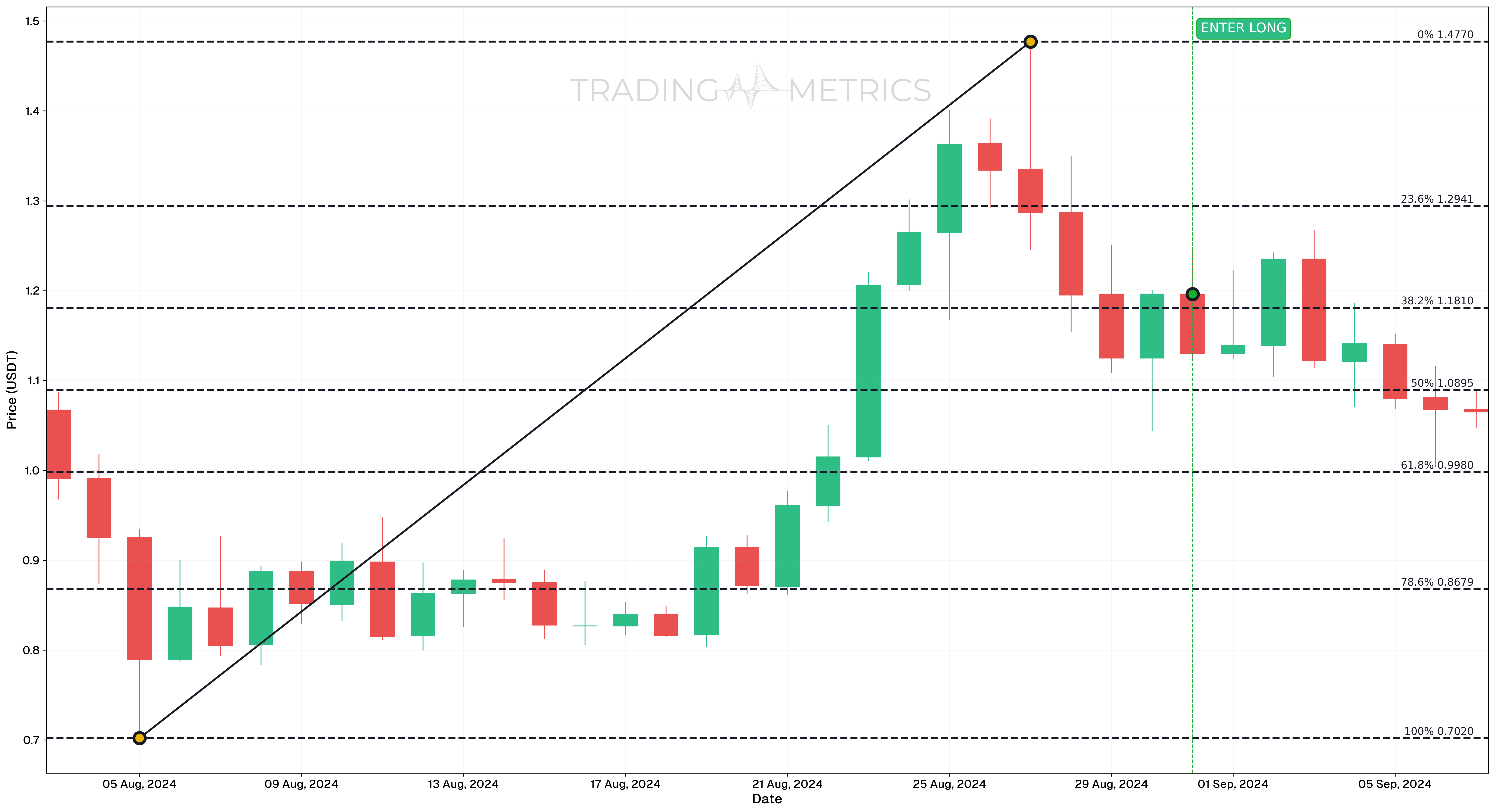 - Entry: A buy signal was generated on August 31, 2024, when the price reached the 38.2% Fibonacci retracement level, suggesting a potential reversal or continuation of the trend.