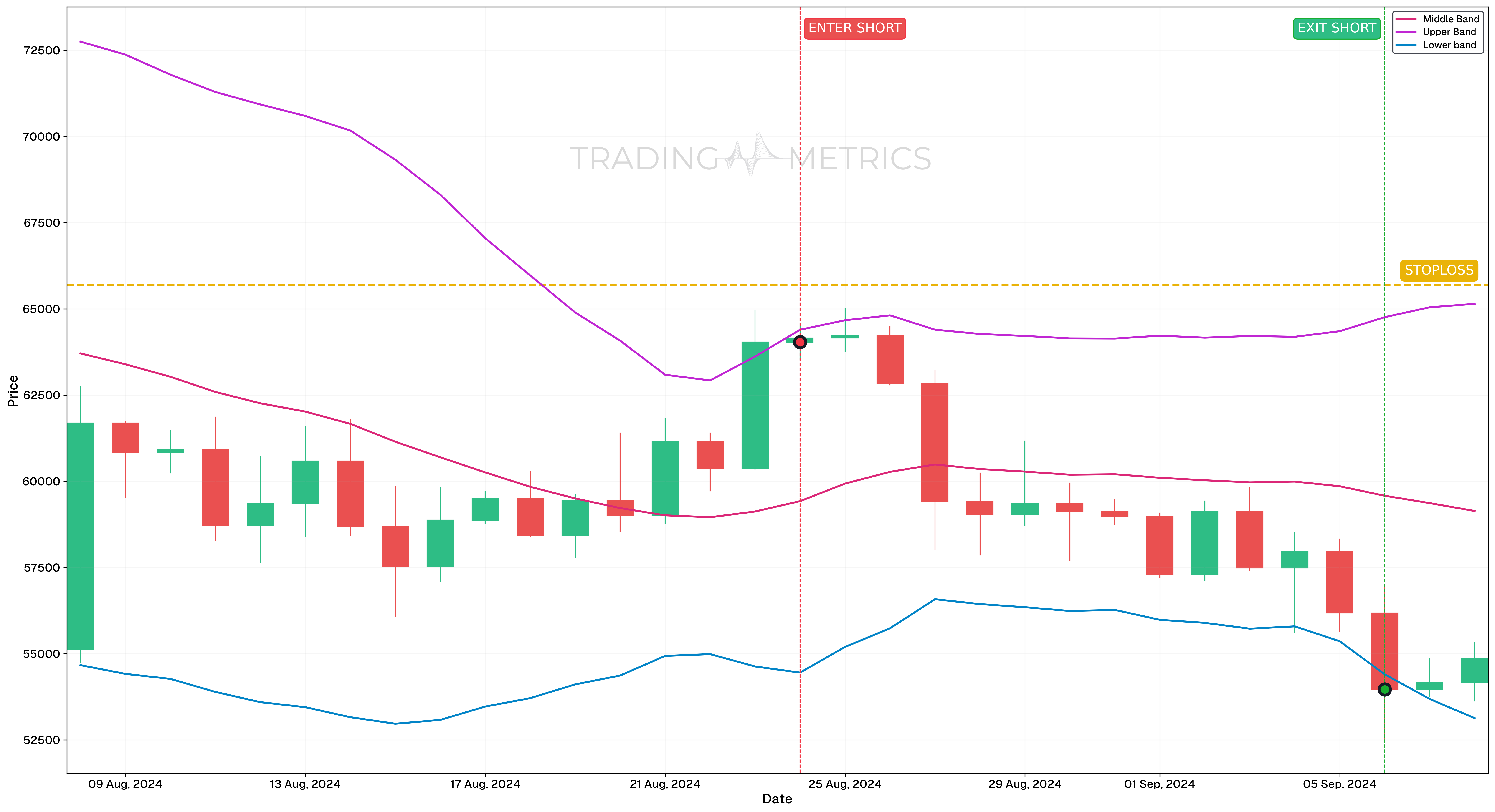 - Stop-Loss Placement: The stop-loss was strategically set at $65,700, positioned slightly above the upper Bollinger Band, allowing for a controlled risk profile while maintaining alignment with the overbought entry signal.