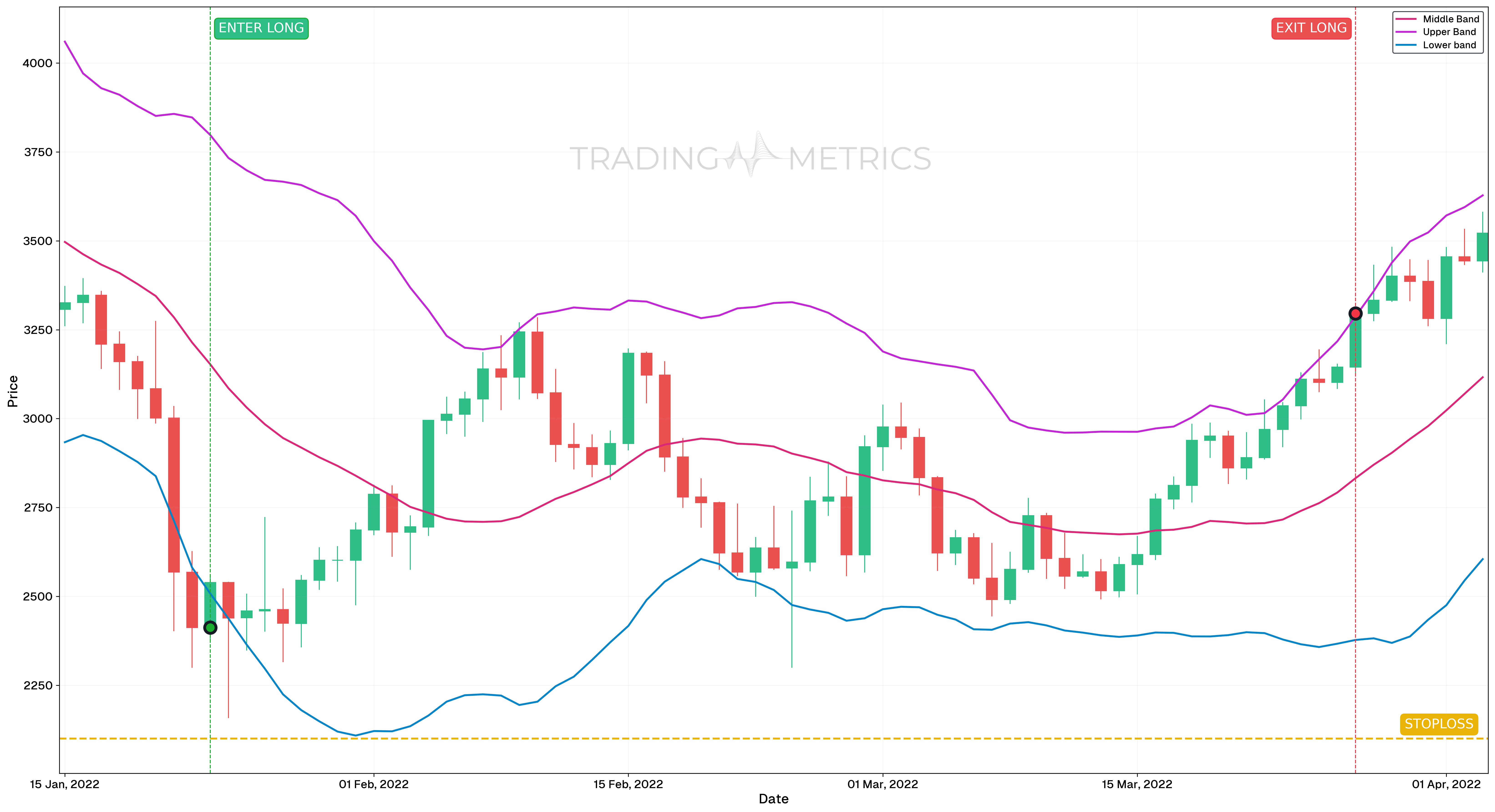 - Entry: On January 23, 2022, a long position was initiated based on the Lower Bollinger Band crossover, highlighting the market’s oversold condition and potential for recovery.