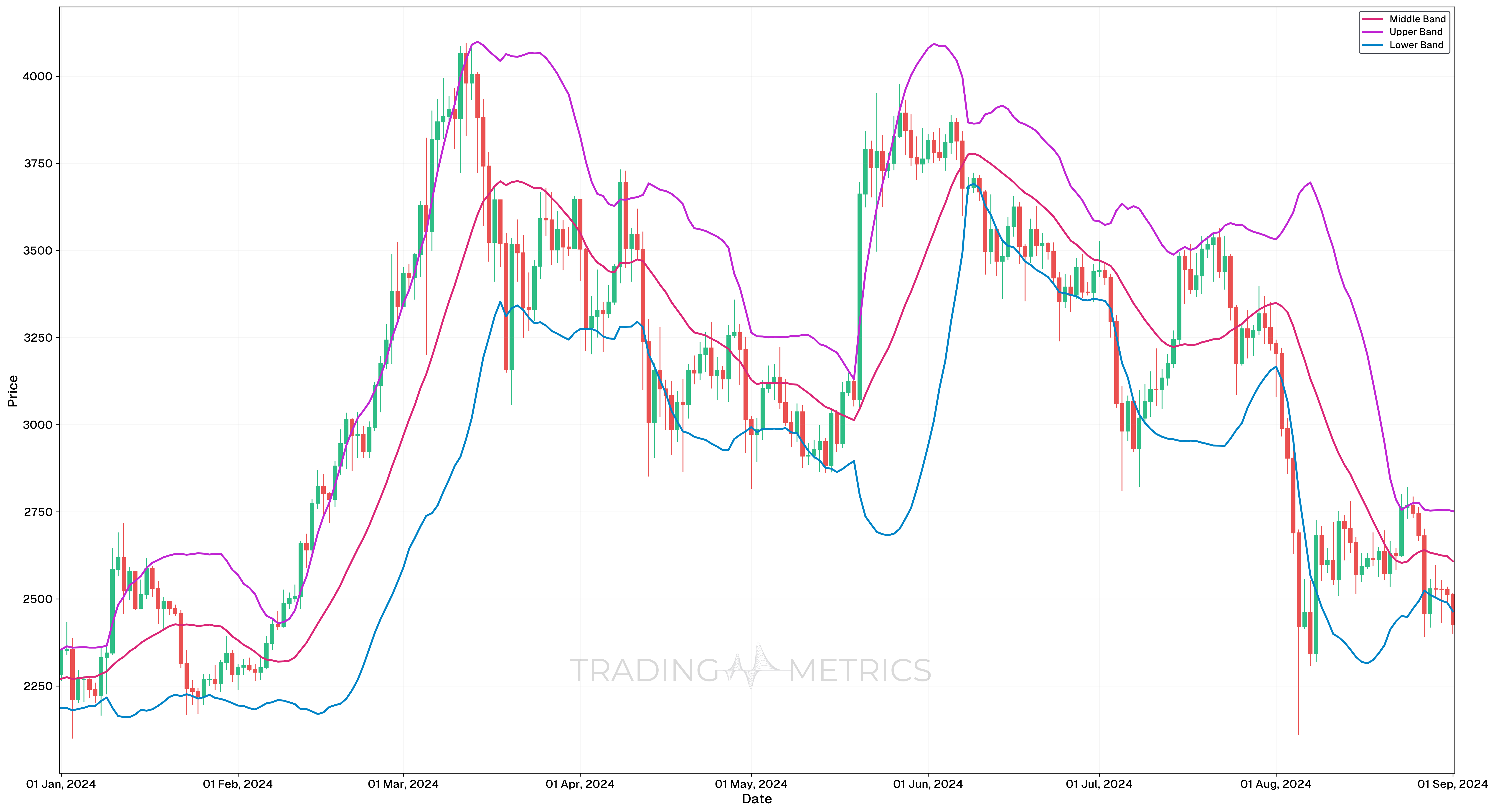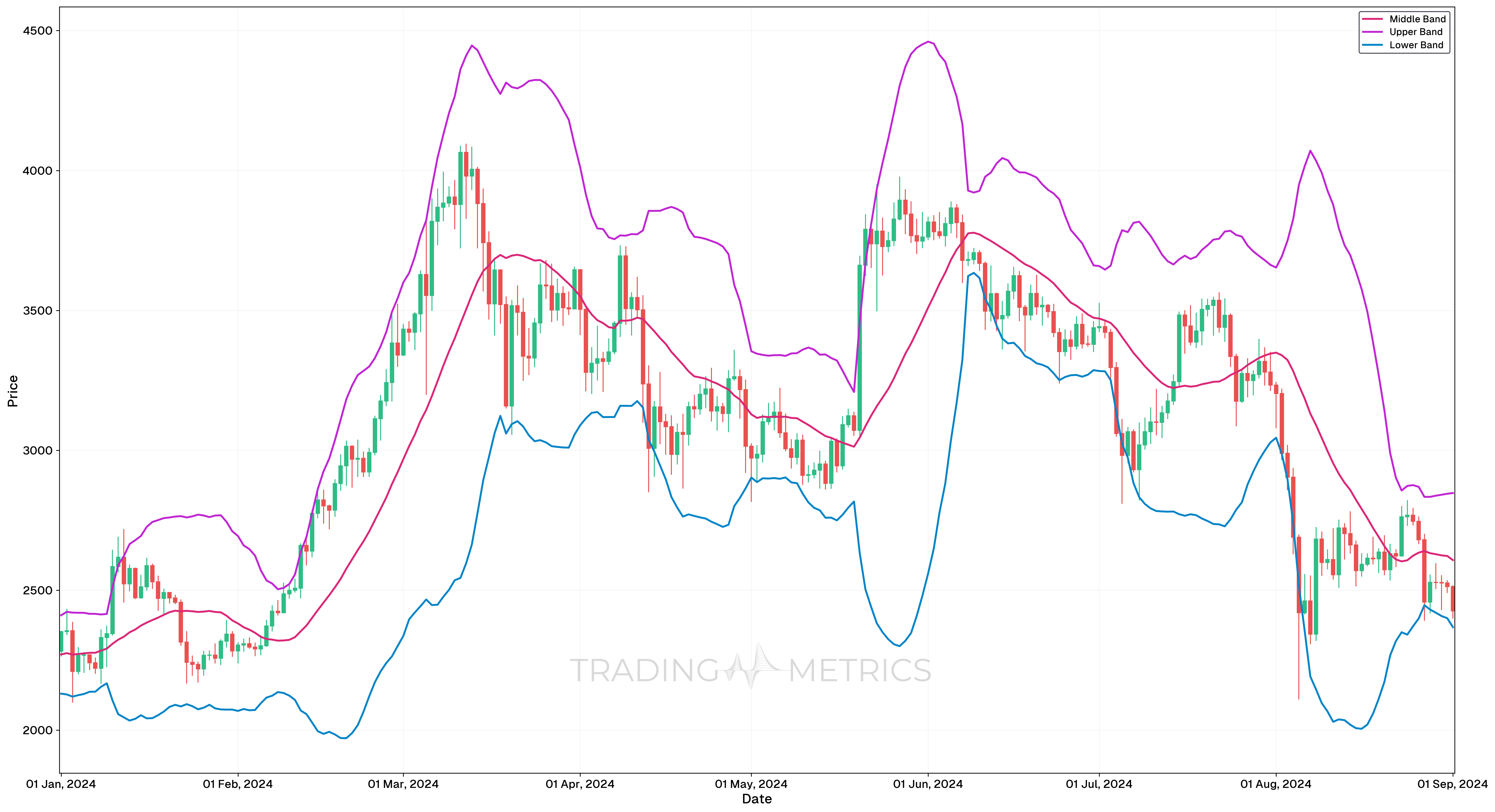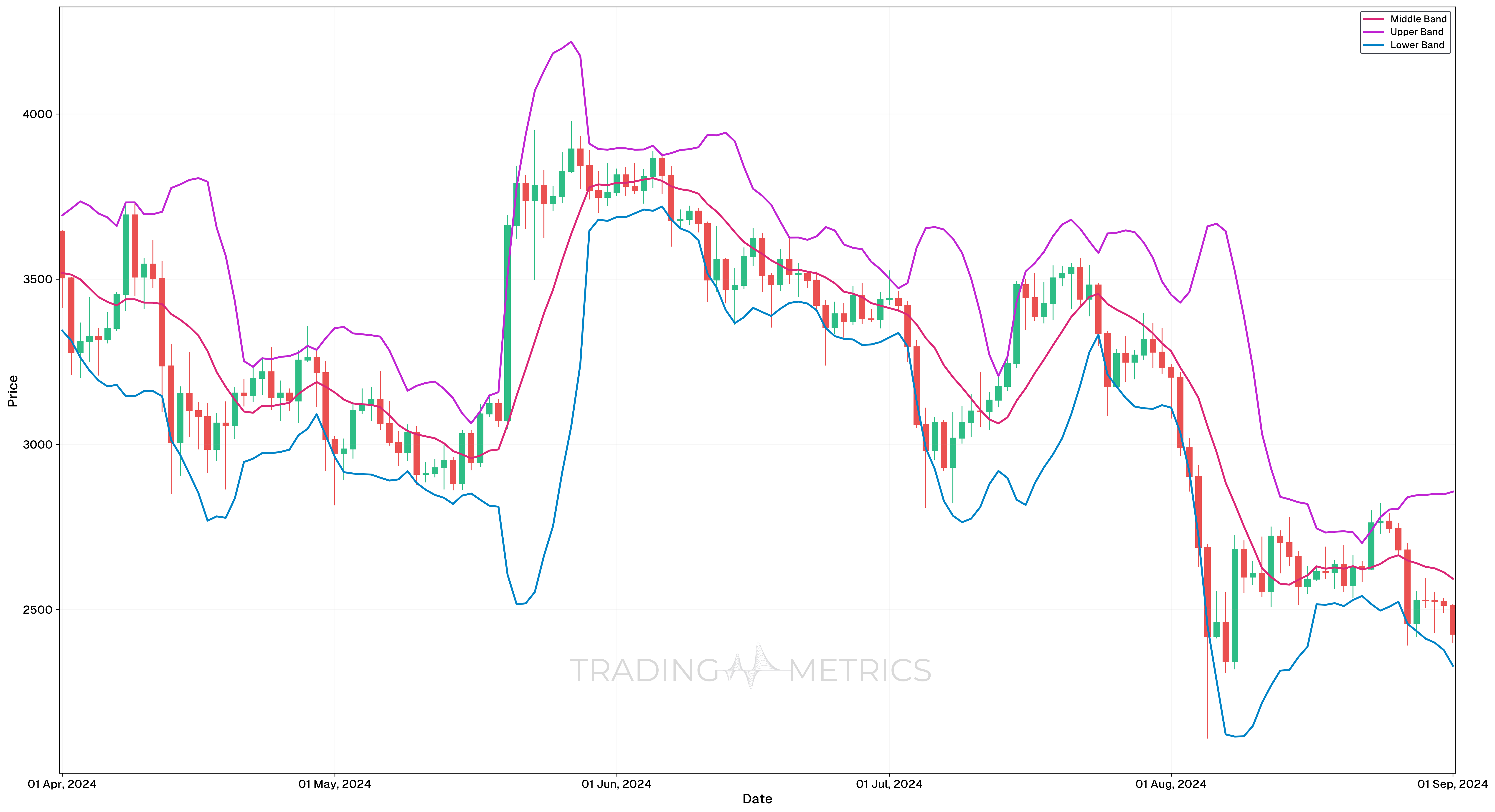 - Range Interpretation: Price near the upper band suggests overbought conditions while price near the lower band indicates oversold conditions.