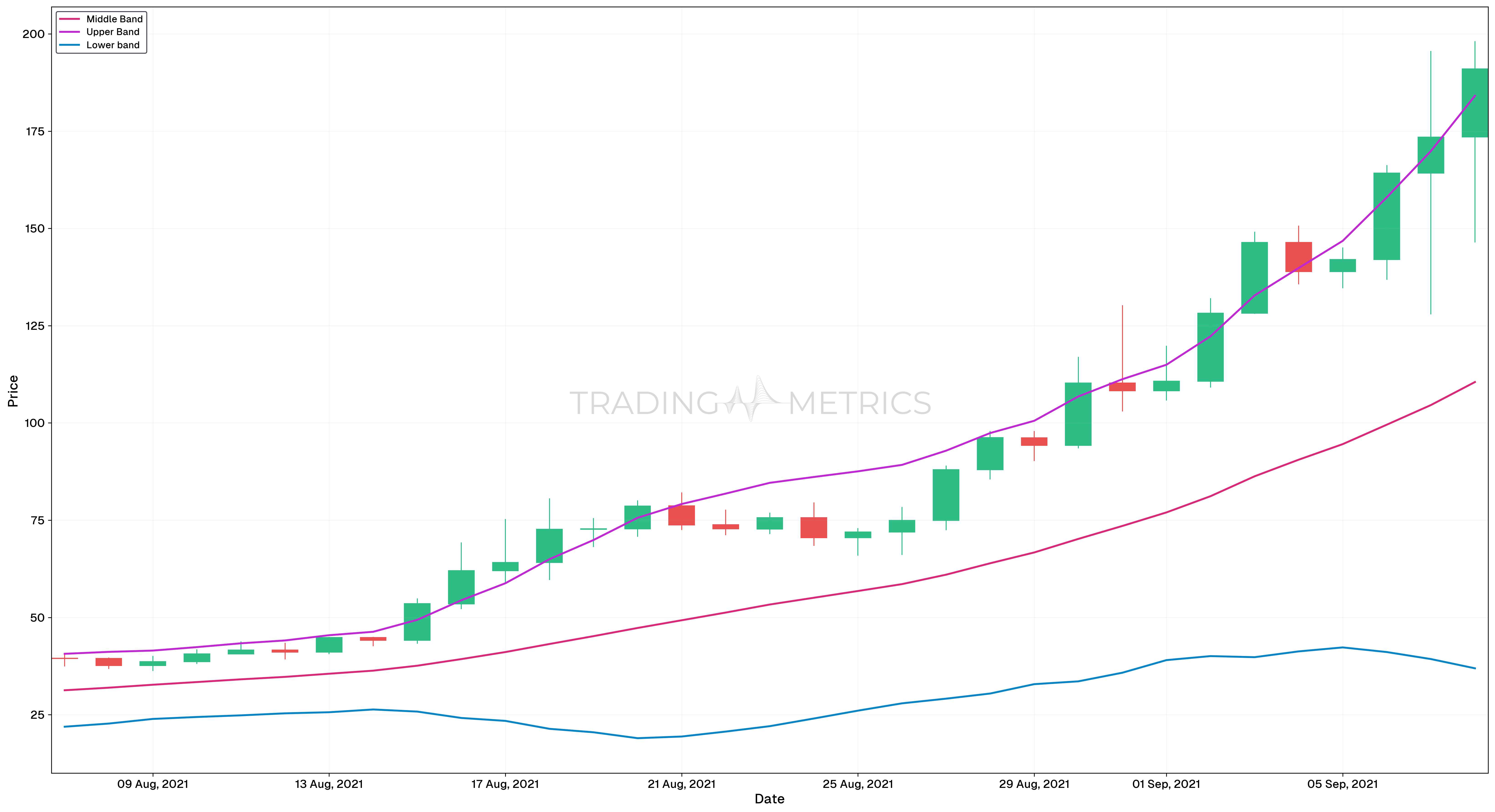This chart displays the price action of the SOL/USDT pair over the date range from August 7, 2021, to September 8, 2021. Throughout this period, the closing price broke above the upper Bollinger Band multiple times, signaling strong bullish momentum. Such Bollinger Band breakouts indicate periods of heightened price volatility and can suggest a continuation of the current trend. During this timeframe, the breakout points often reflected increased buying pressure, reinforcing the notion that price movements outside the bands typically signal strong directional momentum.
