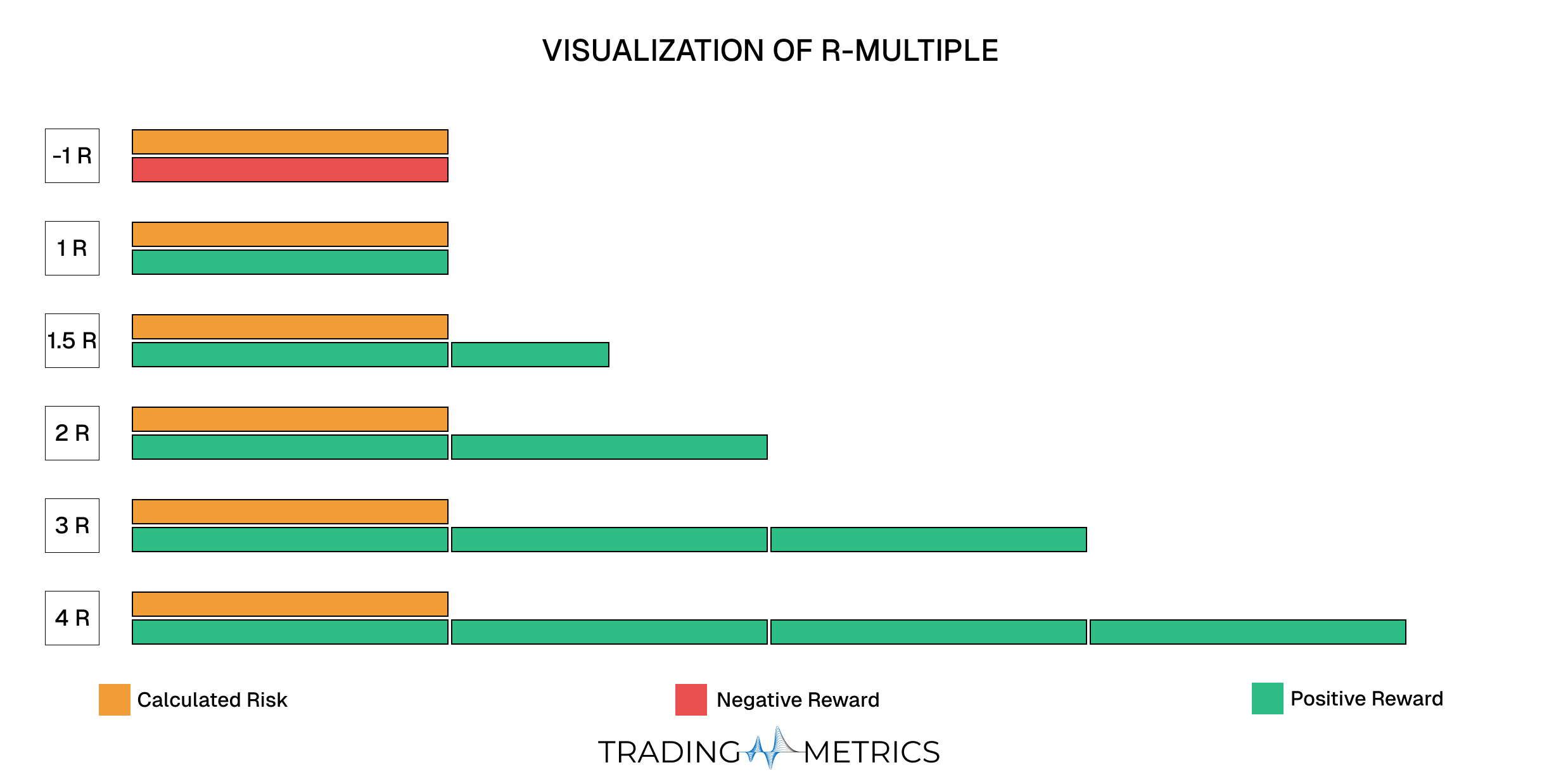 Example: A 1x R-Multiple implies risking $100 to gain $100, requiring success on more than half of your trades to achieve profits.